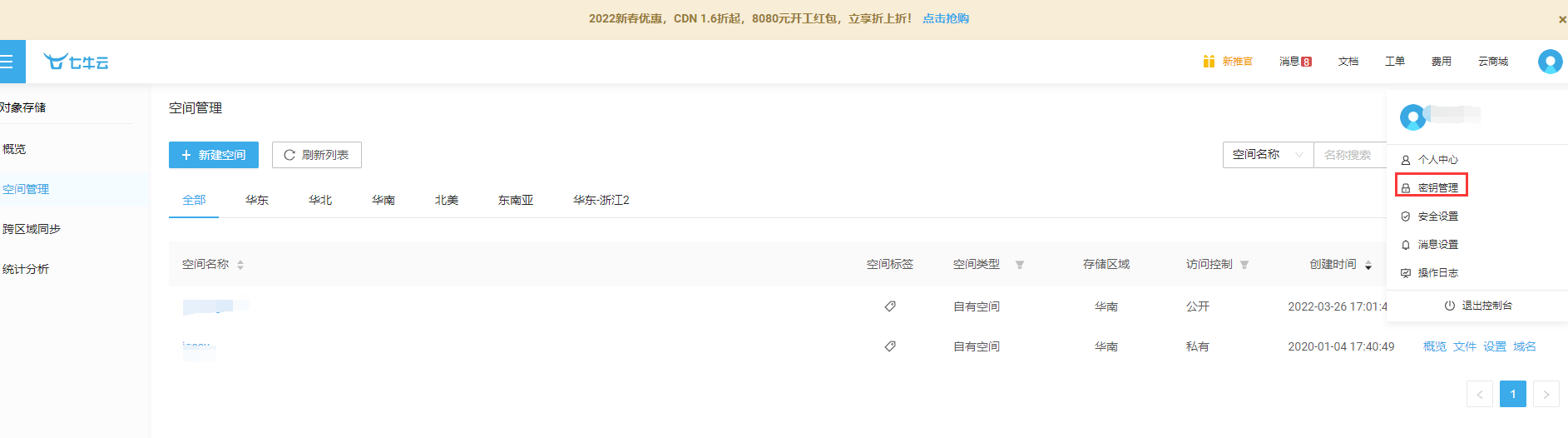 AccessKey: 点击个人头像“密钥管理”即可找到密钥,每个账号可以添加两对密钥SecretKey: 点击个人头像“密钥管理”即可找到密匙,每个账号可以添加两对密钥
