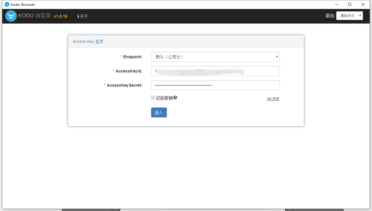 3. 登录,其中AccessKey及SecretKey在网页上右上角密钥管理中添加获取