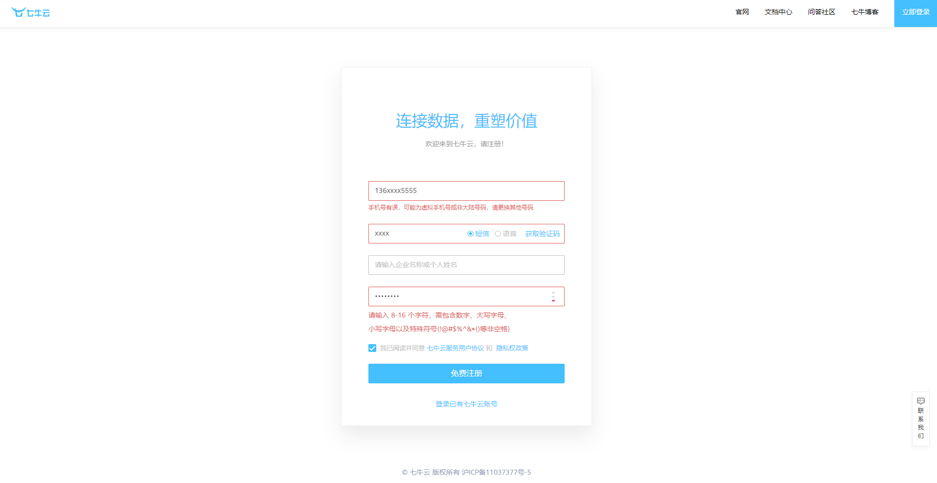 注:七牛云注册,注册成功后需要实名认证,认证完之后才会拥有免费10G的空间使用。