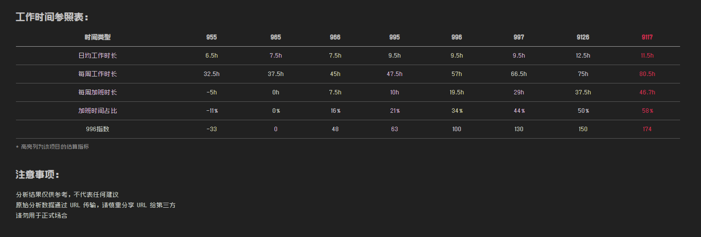 注:996 指数:为 0 则不加班,值越大代表加班越严重,996 工作制对应的值为 100,负值说明工作非常轻松。