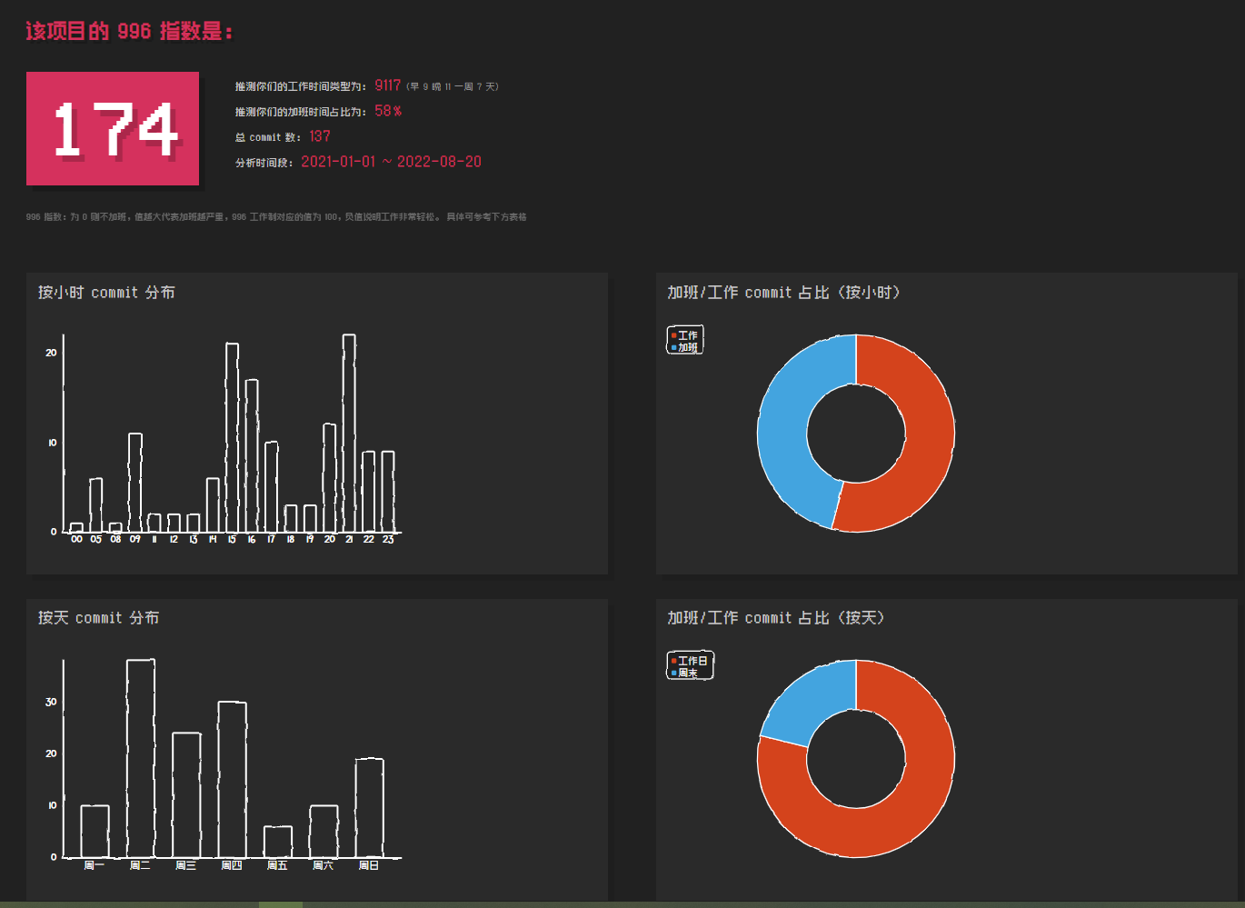 code996 是一个代码分析工具,它将 Git 项目中的 commit 时间分布进行了可视化的展示,进而可以轻松的看出编码工作的实际强度。